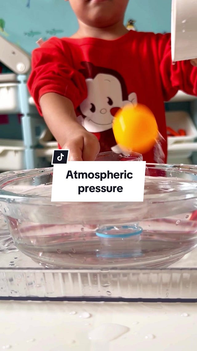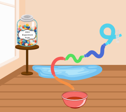 We made a 'river' out of a blue tinsel backdrop and had kids tape stretchy sensory tubes together from the wall and over the river to safely deposit a marble 'experiment.'