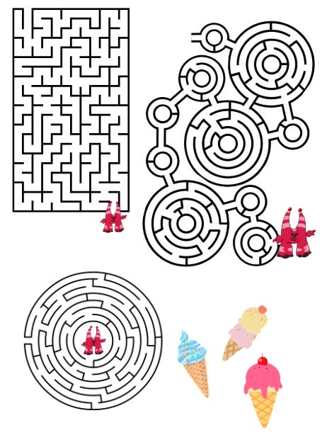 For this station, we laminated mazes (Made curtesy of Canva... They have a lot of free maze options if you search elements.) and ice creams, decorated popsicle sticks to look like Magnarette's striped ears, and added magnets to the ears and ice creams. There were three mazes the kids had complete by putting the ice cream on one side of the maze and the ear on the other. They then would drag the ice-cream though the maze using the magnetic pull from the ear.